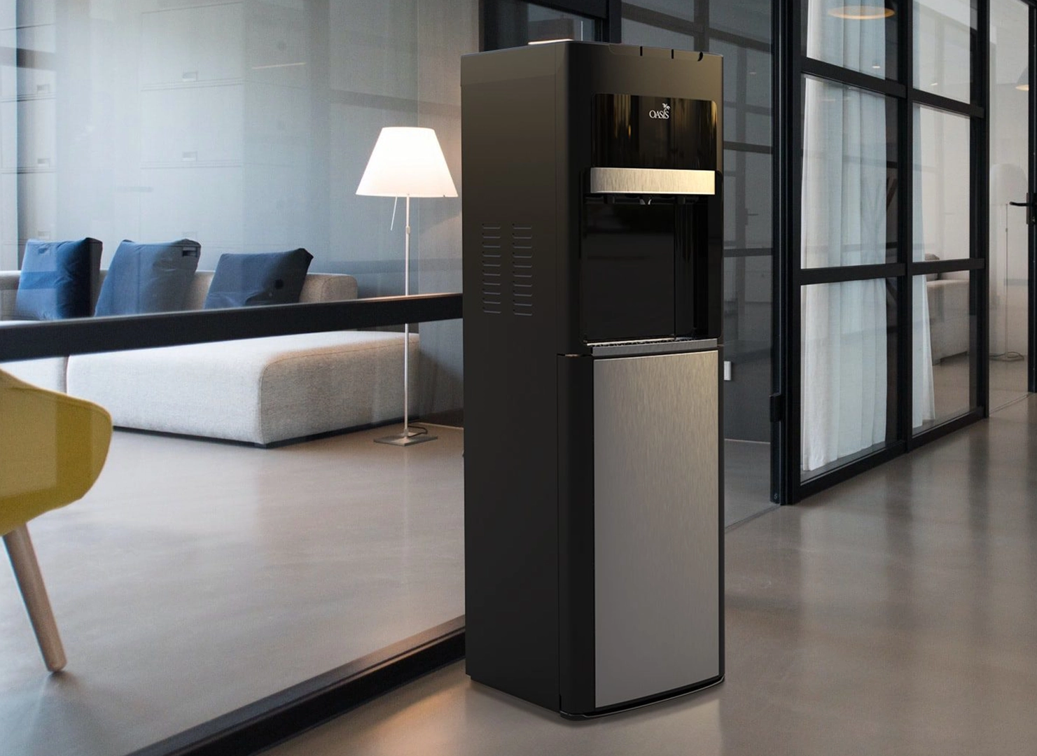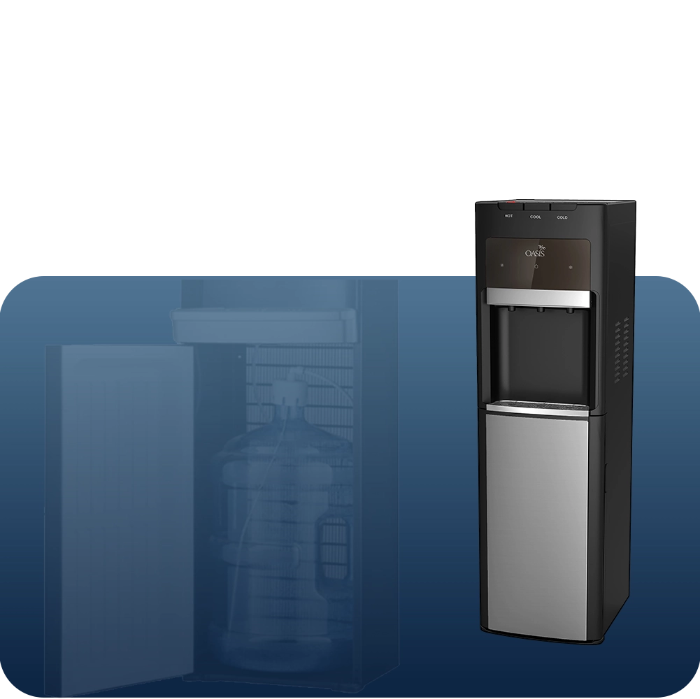 Bottom slides in - no strain. Cleaner look hides the bottle from veiw. Easy-clean design keeps water fresh. Perfect for offices, receptions areas, and home kitchens.